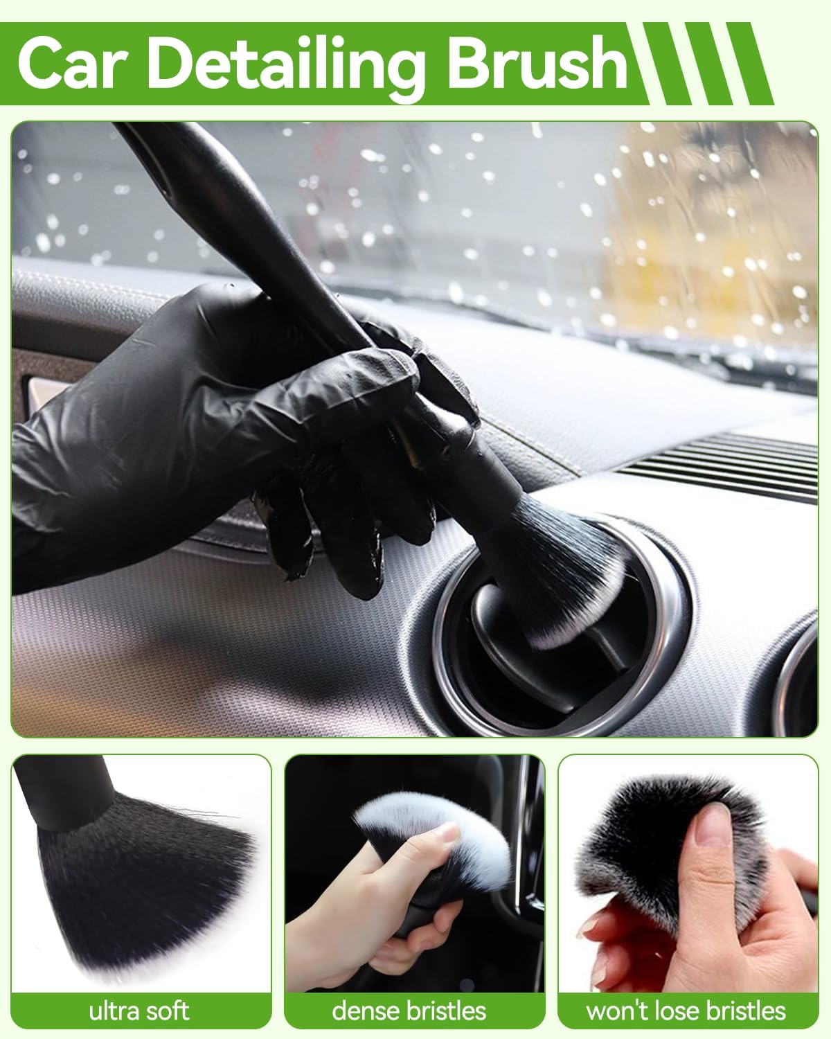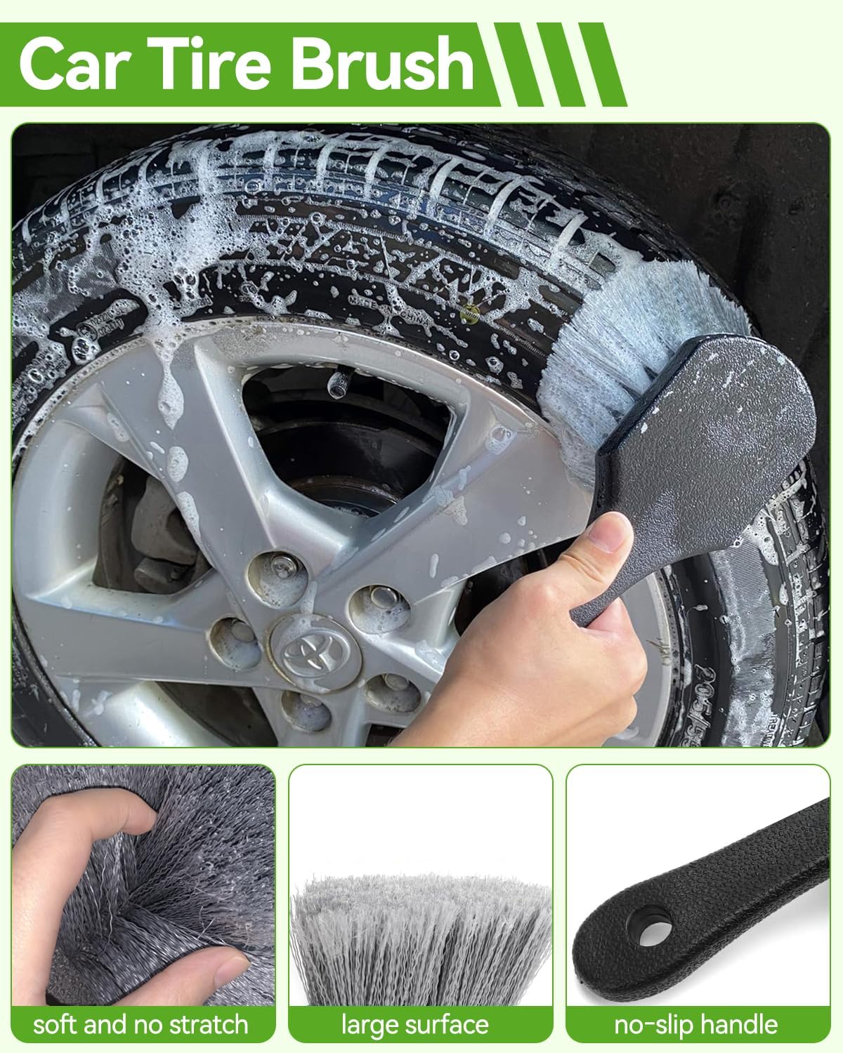 【Wide Usage】Featuring a 180° rotating head, our car wash brush provides optimal flexibility for reaching every corner. Not just for cars, it’s also ideal for household and office cleaning tasks. The wheel hub brush and tire brush effortlessly remove stains from tires, ensuring a thorough clean every time.The dual-use windshield squeegee glides effortlessly on car windows, leaving no watermarks behind. It’s perfect for achieving streak-free clarity.The oversized thick towel is lint-free and quick-drying, ensuring a streak-free finish without shedding.
