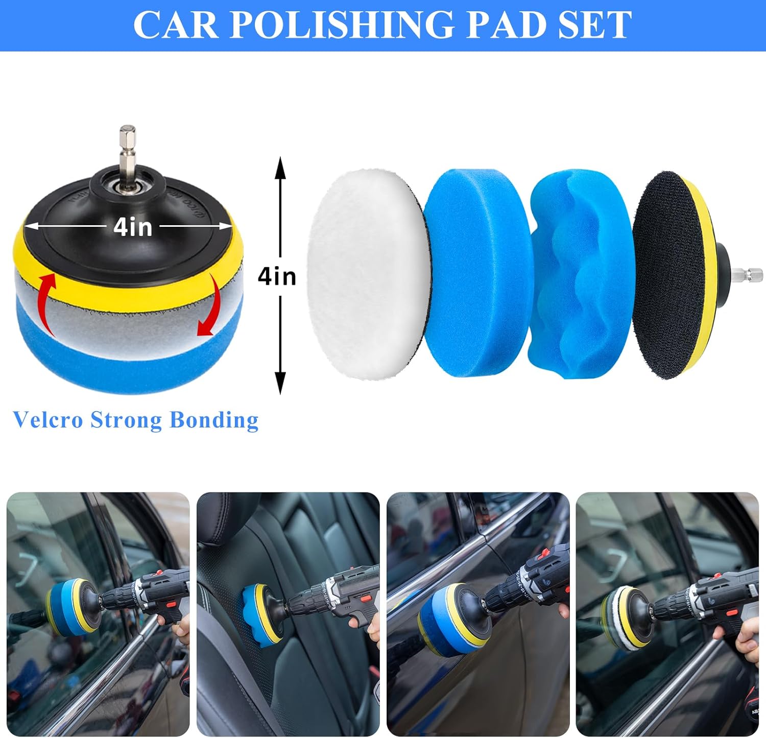 34Pcs Car Detailing Kit: storage bag, drill brushes, wash mitt, towels, tire brush, sponges, polishing pad connector, polishing pad, duster, window water scraper, air conditioner brush, wire brushes, detailing brush set, collapsible bucket, windshield cleaning tool, spray bottle