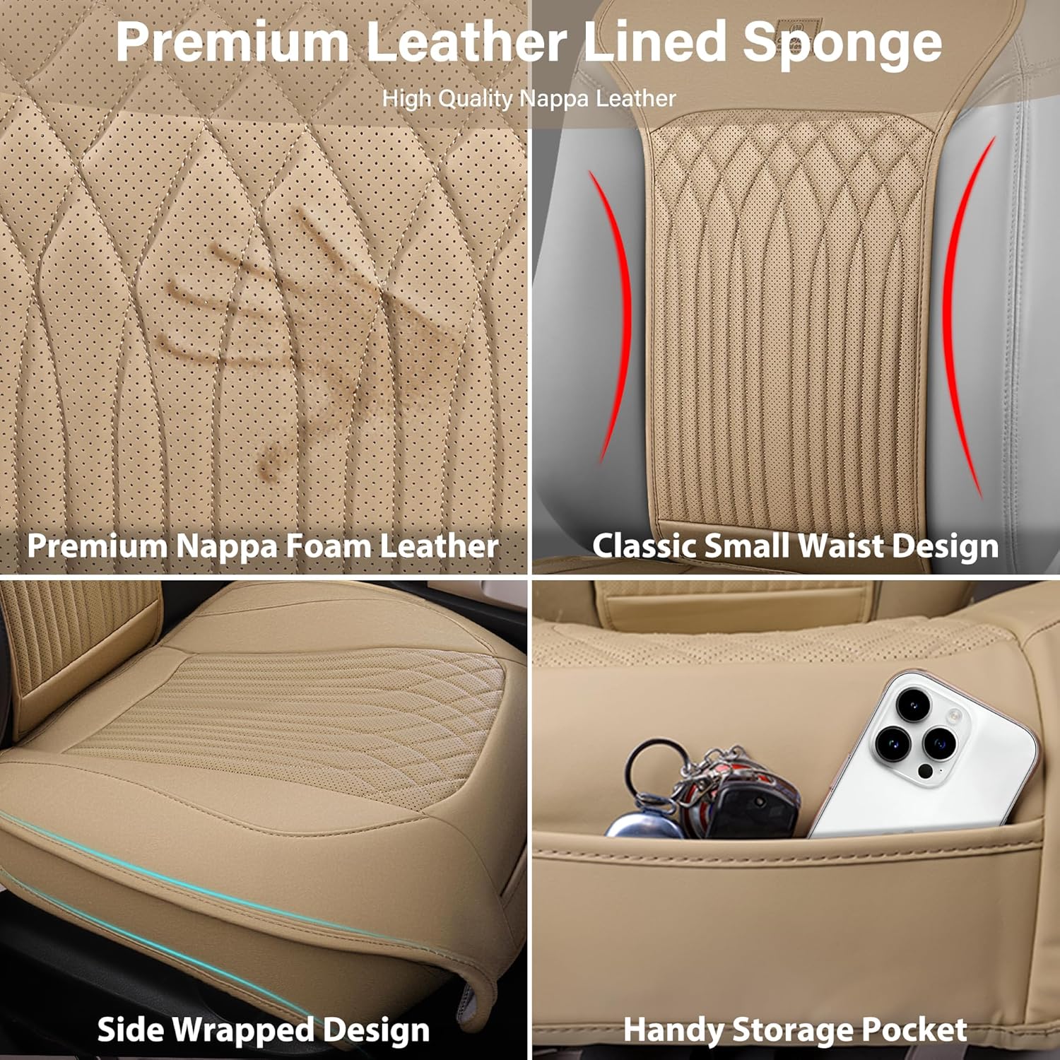 UNIVERSAL FIT: The beige Nappa leather seat covers are designed to universally fit most vehicles, including cars, sedans, trucks, vans, and SUVs. They protect your seats from spills, stains, scratches, and wear. They’re perfect for everyday use, road trips, commuting, and more—blending functionality with long-lasting durability