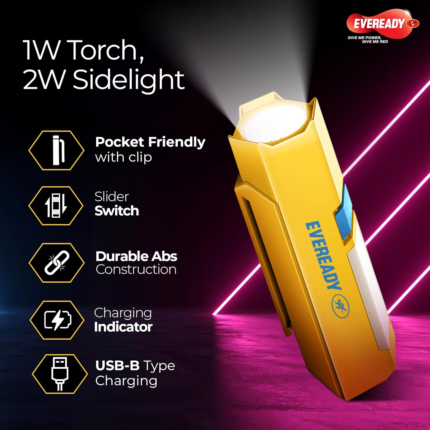 Eveready DL 101 Minimight, 1W Rechargeable LED Emergency Torch + 2W Sidelight, Pocket-Friendly Hexagonal Design, Hands-Free Clip, Type B/Micro USB Charging, Overcharge & Deep Discharge Protection