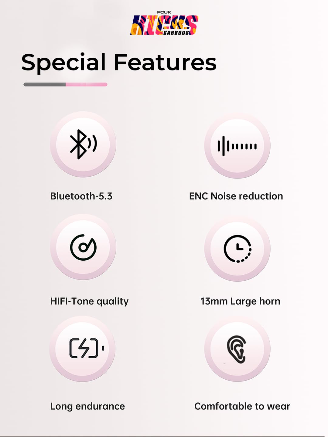 Comfortable Fit: Designed for comfort, FCUK Earpods come with ear tips to ensure a secure and comfortable fit . The earbuds are lightweight and ergonomically designed to minimize ear fatigue, allowing you to wear them