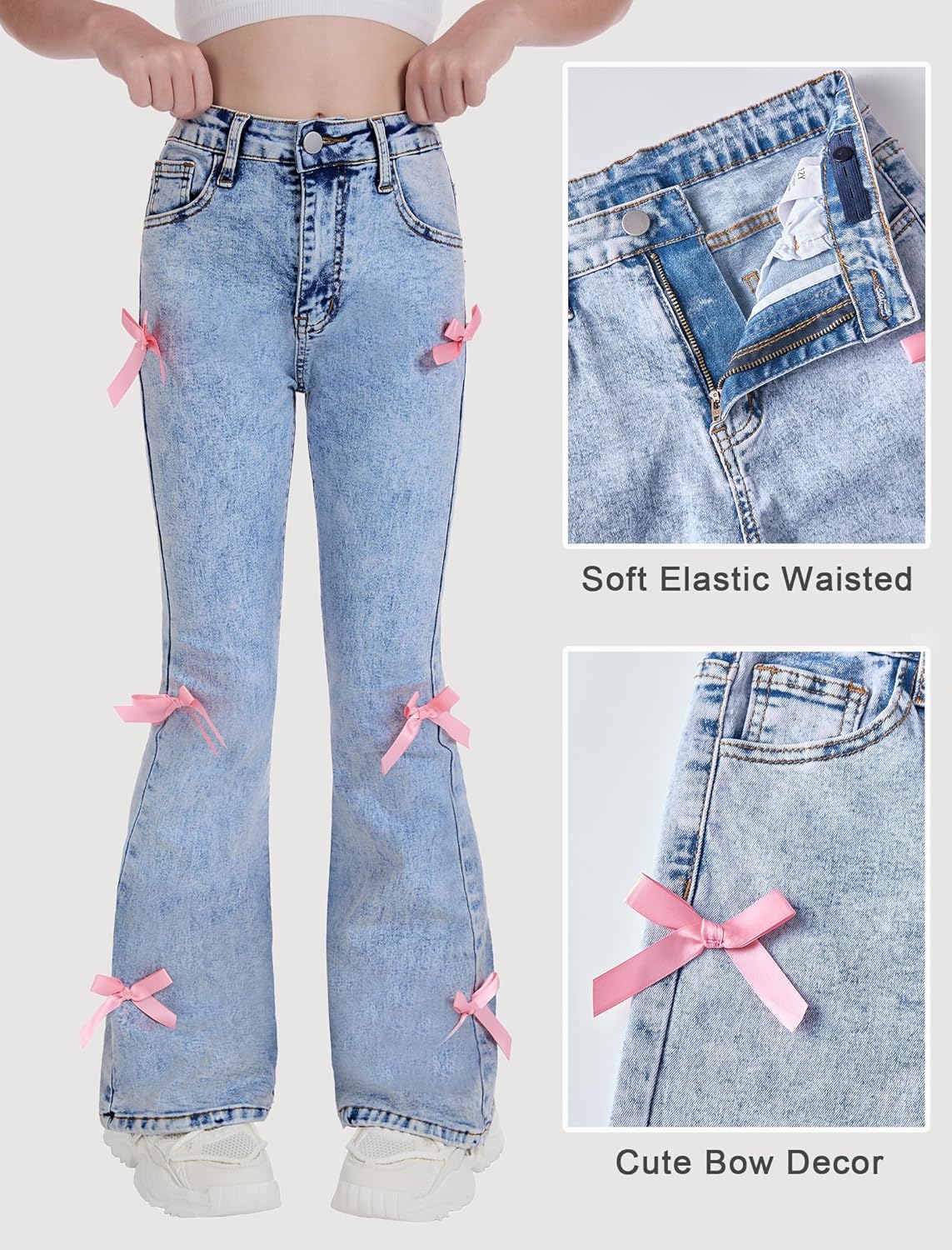 Girls Jeans Flare/Bell Bottom Bow Jeans for Teen High Waist Cute Y2K Stretch Tween Denim Pants 8-16Y