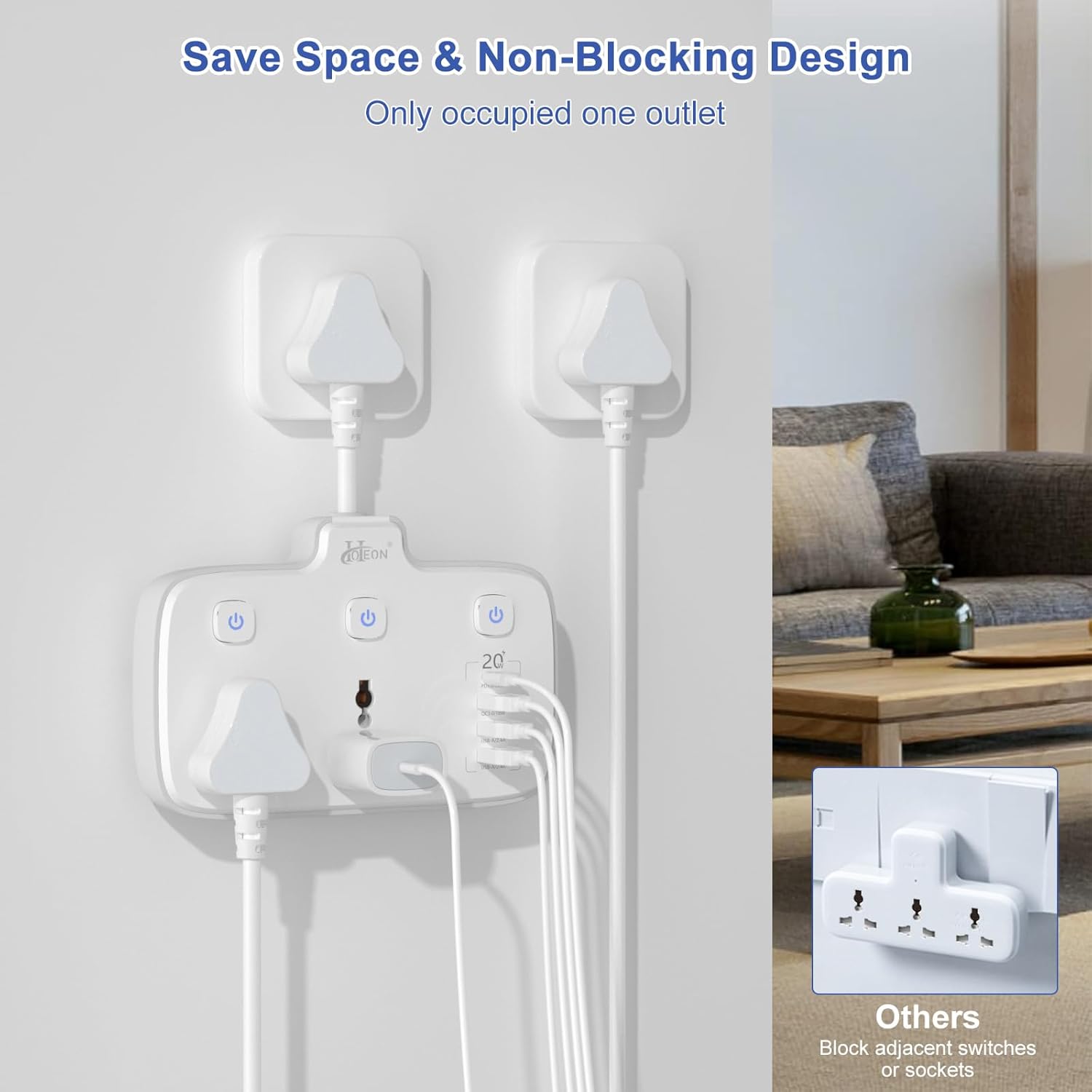 【Convenient Individual ON/OFF Switches】 The extension board with 3 individual switches. Separate switches can individually control your appliances, saving energy when not in use.