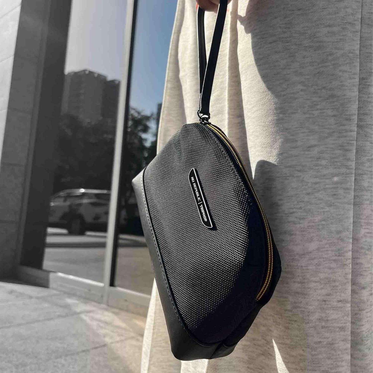Premium Materials, Elevated Build – Engineered with carbon fibre-inspired nylon fabric and vegan leather accents, finished with a leather grip base and a smooth metallic zipper. Durable, scratch-resistant, and made to move with your daily hustle.