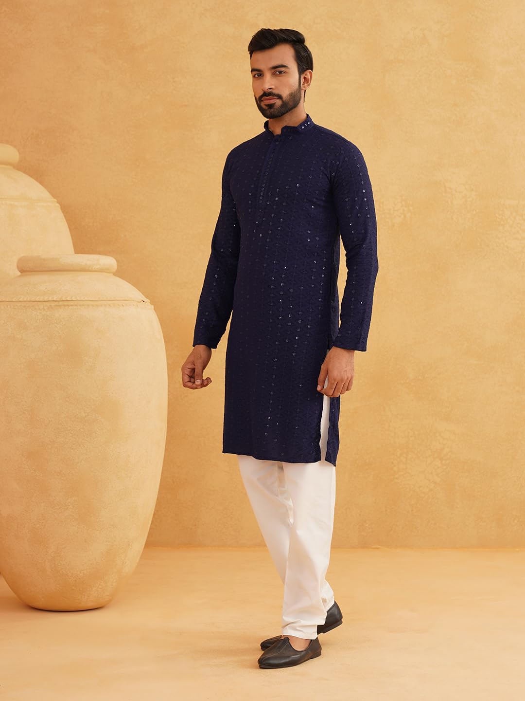 Sojanya (Since 1958 Men’S Sequinned Embroidered Cotton Kurta And White Pyjama Set