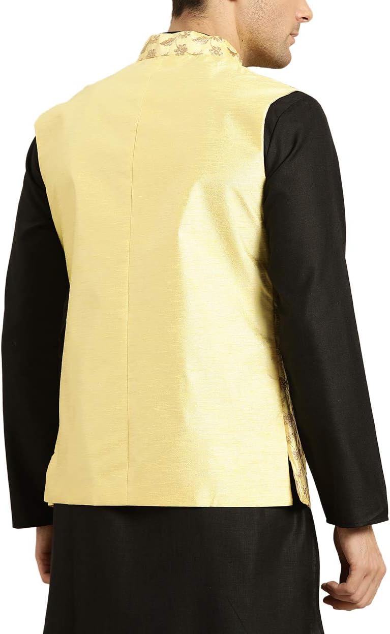 SOJANYA as a brand brings you quality and affordability. In market since 1958, we take pride in our commitment to maintain quality standards in each piece manufactured by us. Look edgy by layering your ethnic attire with this beautifully designed embroidered Nehru jacket from SOJANYA. This is Made up of premium Silk Blend Fabric and is Beige & gold in color. Team this with kurta pyjama (preferably in contrast color), and look apart on special occasions.