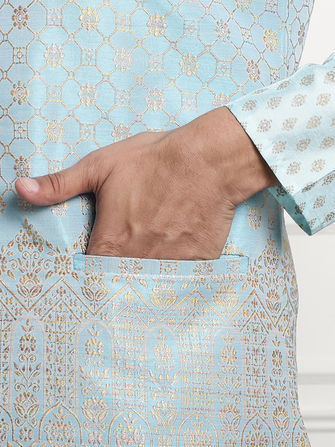 SOJANYA as a brand brings you quality and affordability. In market since 1958, we take pride in our commitment to maintain quality standards in each piece manufactured by us. A true epitome of class, this Printed kurta and churidaar pyjama With Heavy Embroidered Nehru jacket will surely reflect your impeccable taste in fashion. Both Kurta & Nehrujacket are made up of Silk Blend and pyjama is made of Pure cotton fabric. Team this set with elegant Mojris and look apart on special occasions.