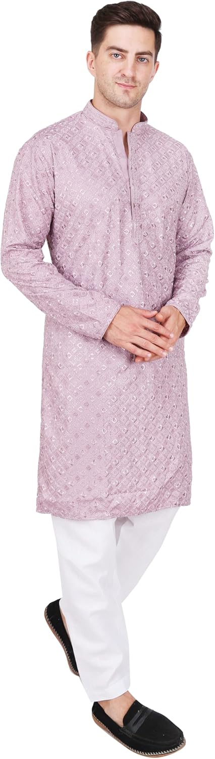 TRILOKI Mens Embroidered Sequined Kurta Pajama Set Rayon Ethnic Indian Traditional Wear